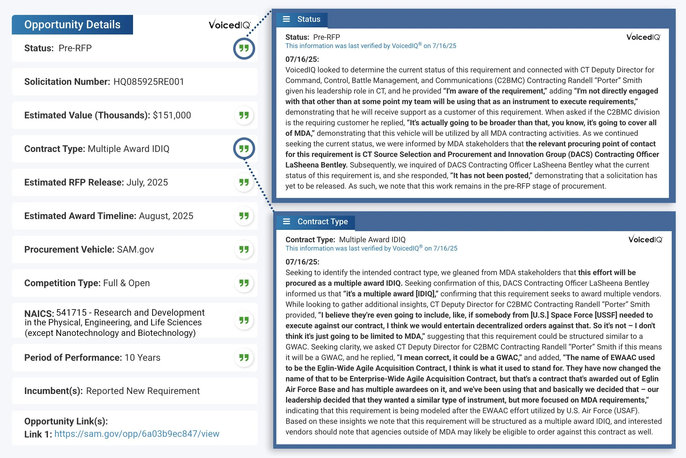 Our valuable VoicedIQ intelligence is spoken directly to us by government decision-makers for maximum accuracy and is transcribed in real-time using the government’s own words. This verbally-sourced intel, combined with our AI algorithm, ensures that each conversation is uniquely targeted and yields highly relevant and actionable information. The result? The most accurate bid intelligence within the GovCon industry, providing our customers with unmatched insights into upcoming requirements.